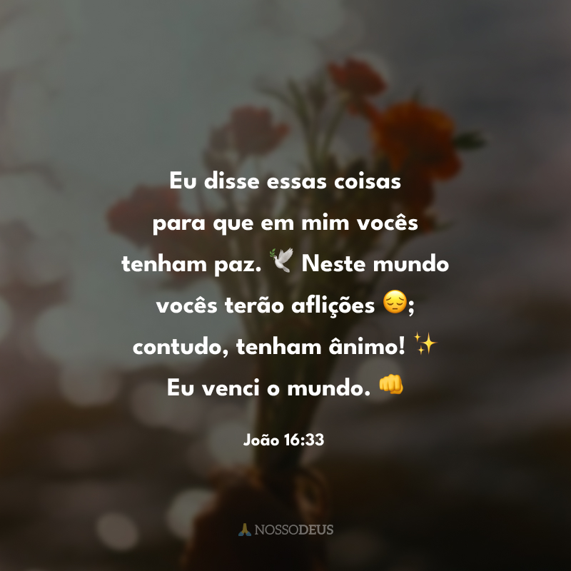 Eu disse essas coisas para que em mim vocês tenham paz. 🕊 Neste mundo vocês terão aflições 😔; contudo, tenham ânimo! ✨ Eu venci o mundo. 👊