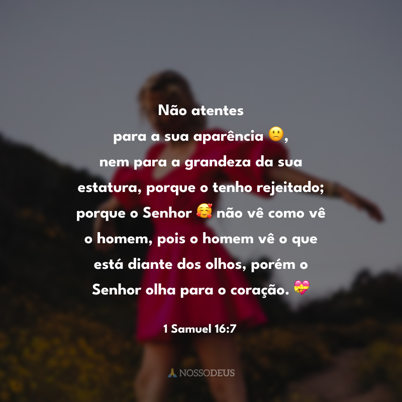 Não atentes para a sua aparência 🙁, nem para a grandeza da sua estatura, porque o tenho rejeitado; porque o Senhor 🥰 não vê como vê o homem, pois o homem vê o que está diante dos olhos, porém o Senhor olha para o coração. 💝