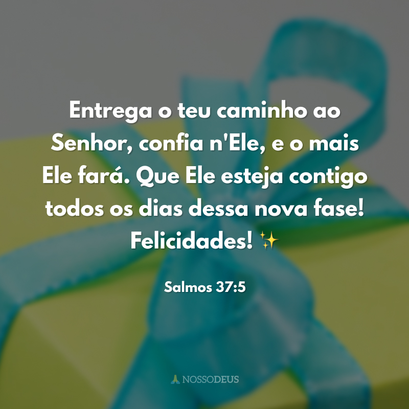 Entrega o teu caminho ao Senhor, confia n'Ele, e o mais Ele fará. Que Ele esteja contigo todos os dias dessa nova fase! Felicidades! ✨