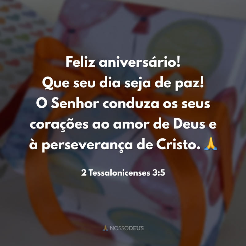 Feliz aniversário! Que seu dia seja de paz! O Senhor conduza os seus corações ao amor de Deus e à perseverança de Cristo. 🙏