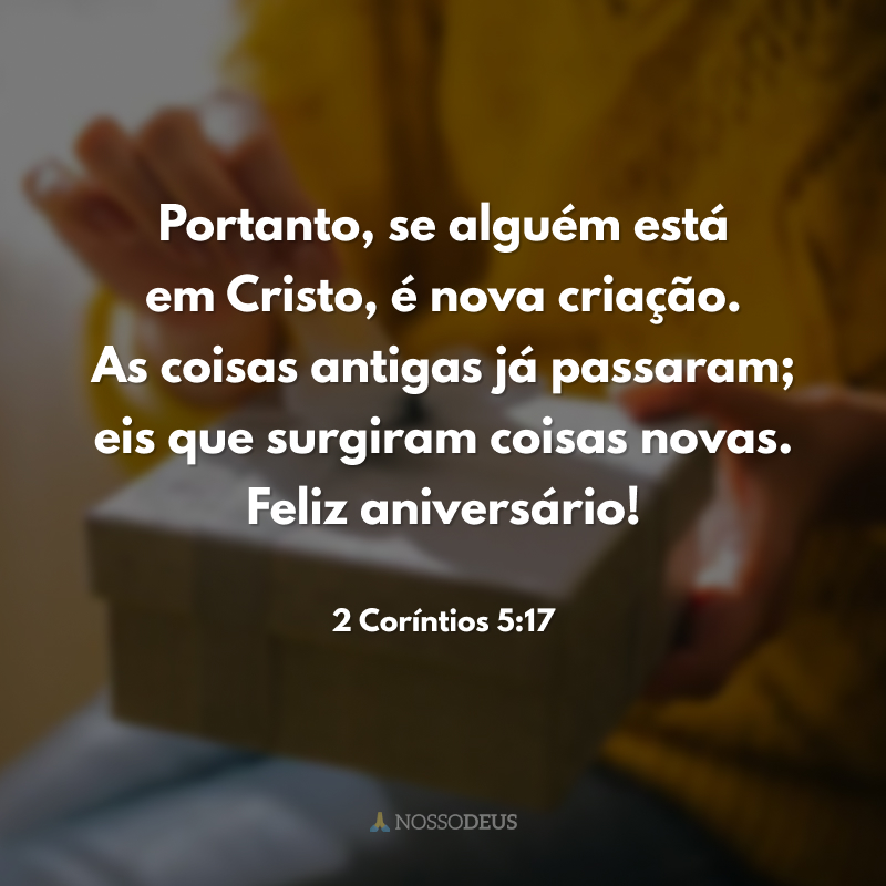 Portanto, se alguém está em Cristo, é nova criação. As coisas antigas já passaram; eis que surgiram coisas novas. Feliz aniversário!