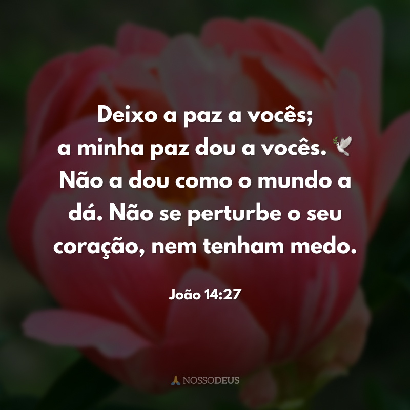Deixo a paz a vocês; a minha paz dou a vocês. 🕊 Não a dou como o mundo a dá. Não se perturbe o seu coração, nem tenham medo.