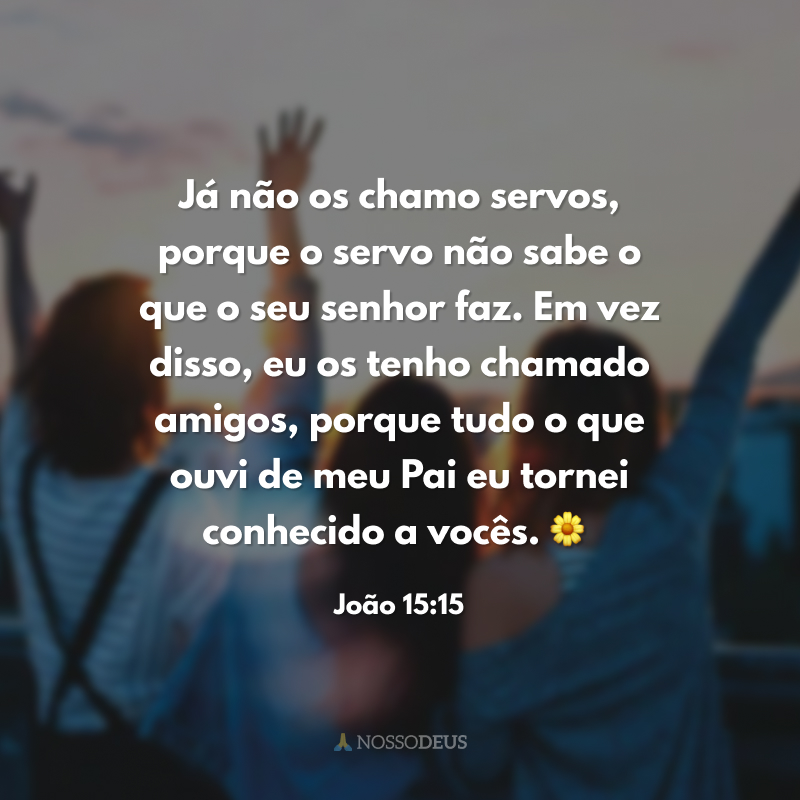 Já não os chamo servos, porque o servo não sabe o que o seu senhor faz. Em vez disso, eu os tenho chamado amigos, porque tudo o que ouvi de meu Pai eu tornei conhecido a vocês. 🌼