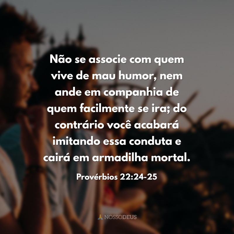 Não se associe com quem vive de mau humor, nem ande em companhia de quem facilmente se ira; do contrário você acabará imitando essa conduta e cairá em armadilha mortal.