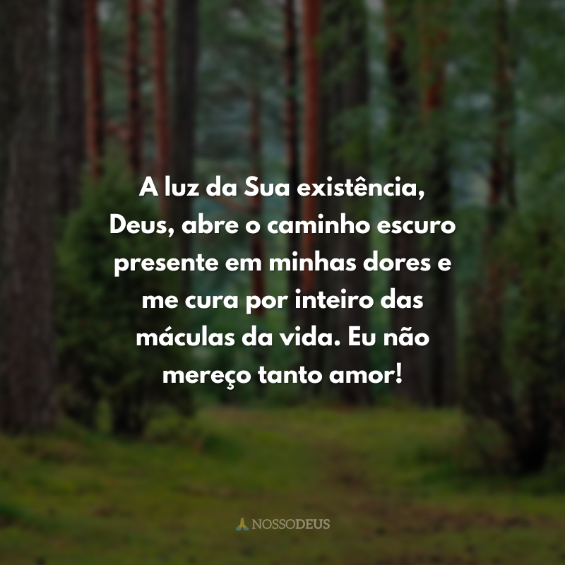 A luz da Sua existência, Deus, abre o caminho escuro presente em minhas dores e me cura por inteiro das máculas da vida. Eu não mereço tanto amor!