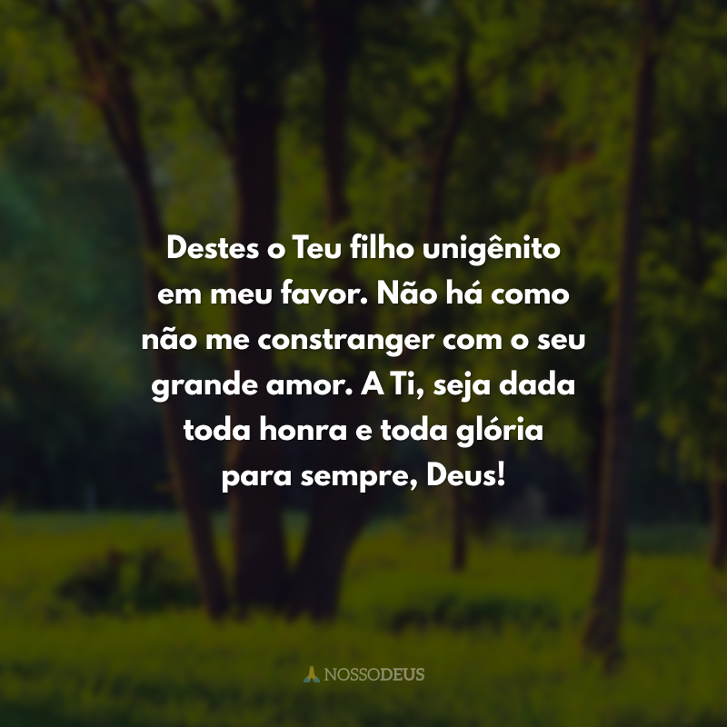 Destes o Teu filho unigênito em meu favor. Não há como não me constranger com o seu grande amor. A Ti, seja dada toda honra e toda glória para sempre, Deus!