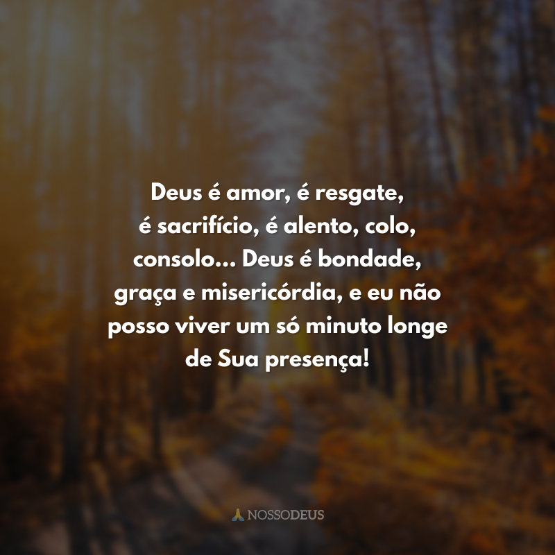 Deus é amor, é resgate, é sacrifício, é alento, colo, consolo... Deus é bondade, graça e misericórdia, e eu não posso viver um só minuto longe de Sua presença!