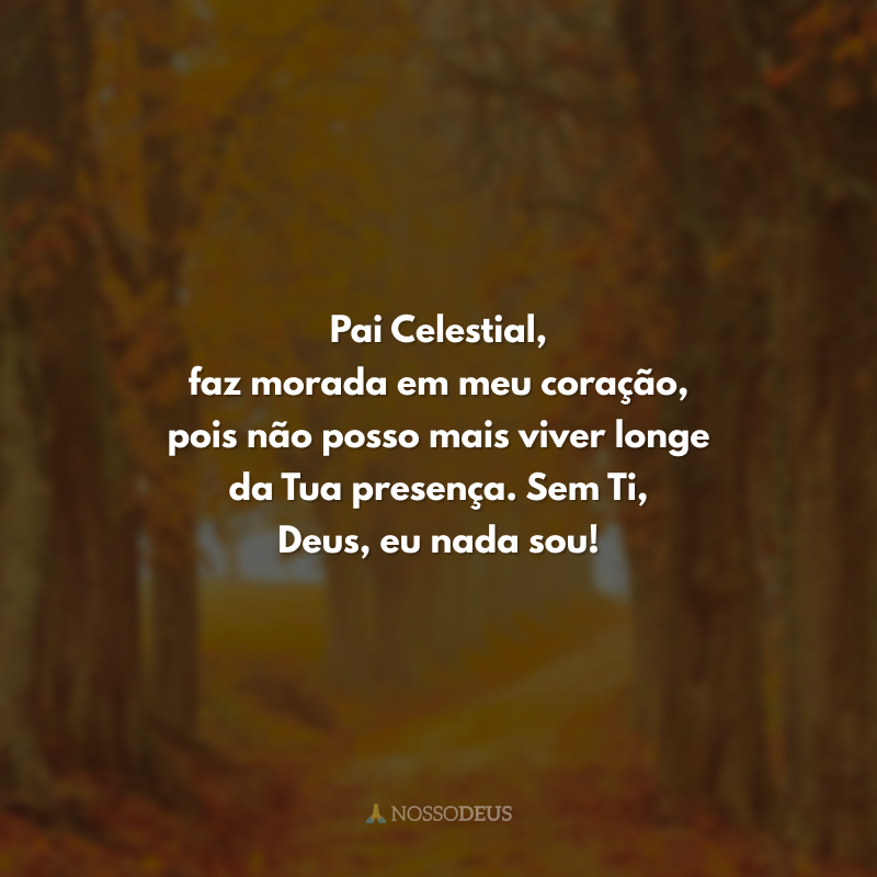 Pai Celestial, faz morada em meu coração, pois não posso mais viver longe da Tua presença. Sem Ti, Deus, eu nada sou!