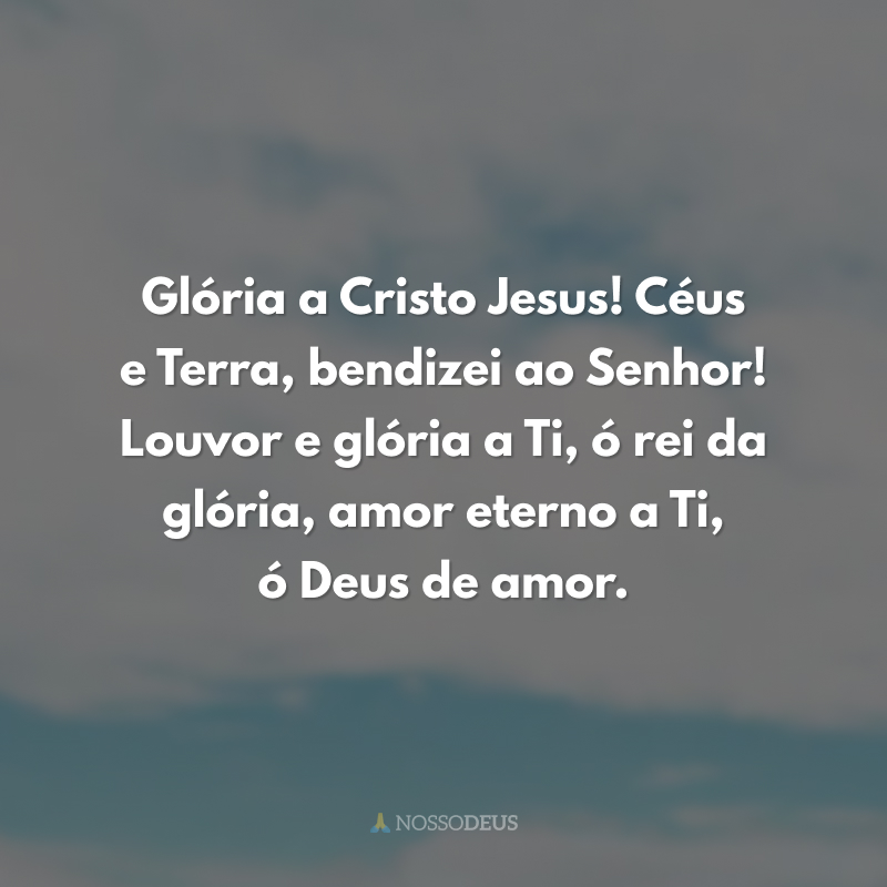 Glória a Cristo Jesus! Céus e Terra, bendizei ao Senhor! Louvor e glória a Ti, ó rei da glória, amor eterno a Ti, ó Deus de amor.
