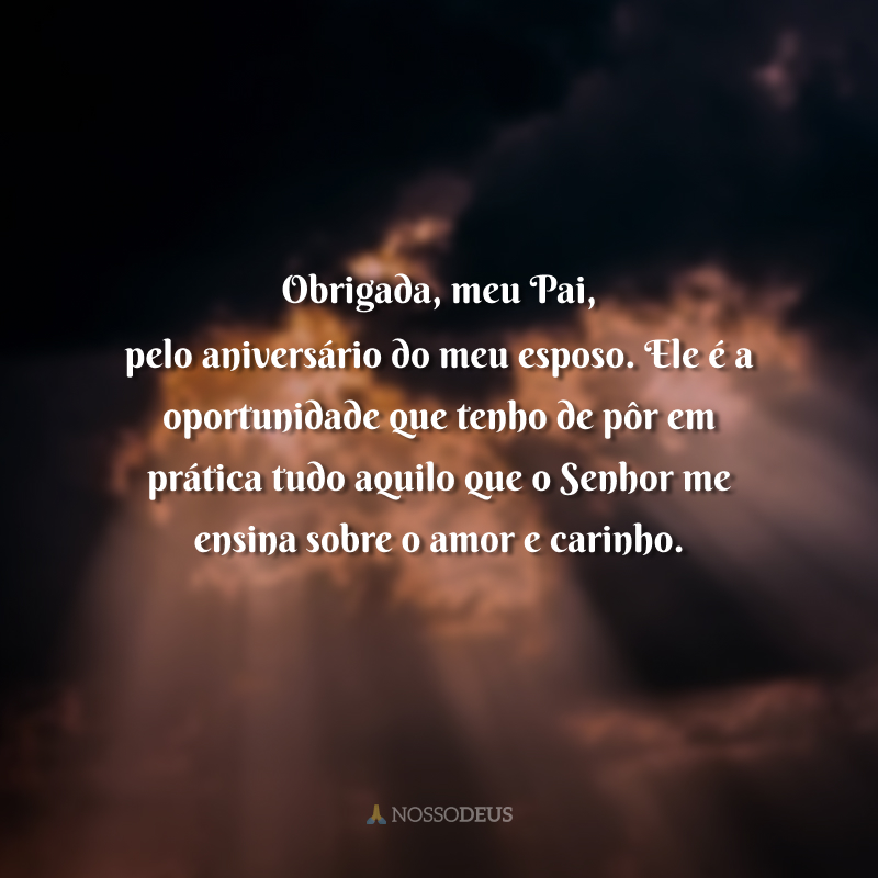 Obrigada, meu Pai, pelo aniversário do meu esposo. Ele é a oportunidade que tenho de pôr em prática tudo aquilo que o Senhor me ensina sobre o amor e carinho.