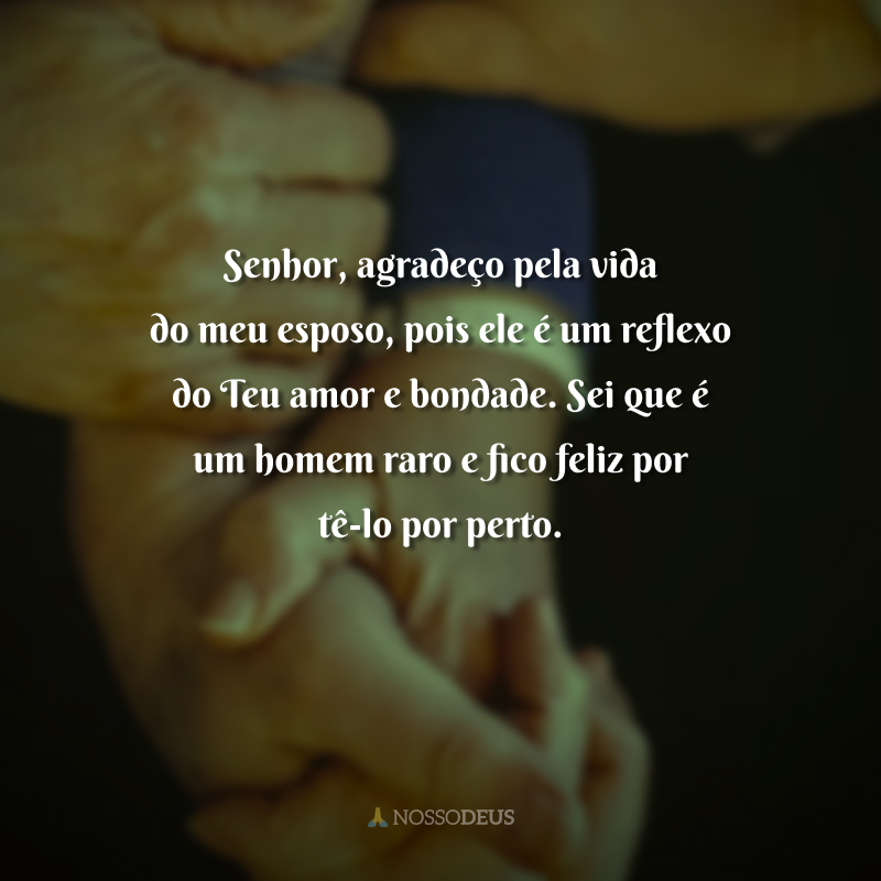 Senhor, agradeço pela vida do meu esposo, pois ele é um reflexo do Teu amor e bondade. Sei que é um homem raro e fico feliz por tê-lo por perto.