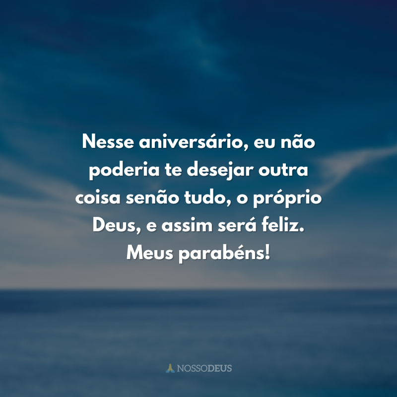 Nesse aniversário, eu não poderia te desejar outra coisa senão tudo, o próprio Deus, e assim será feliz. Meus parabéns!