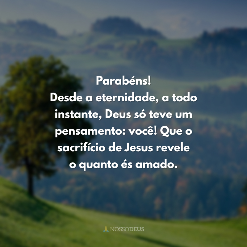 Parabéns! Desde a eternidade, a todo instante, Deus só teve um pensamento: você! Que o sacrifício de Jesus revele o quanto és amado.