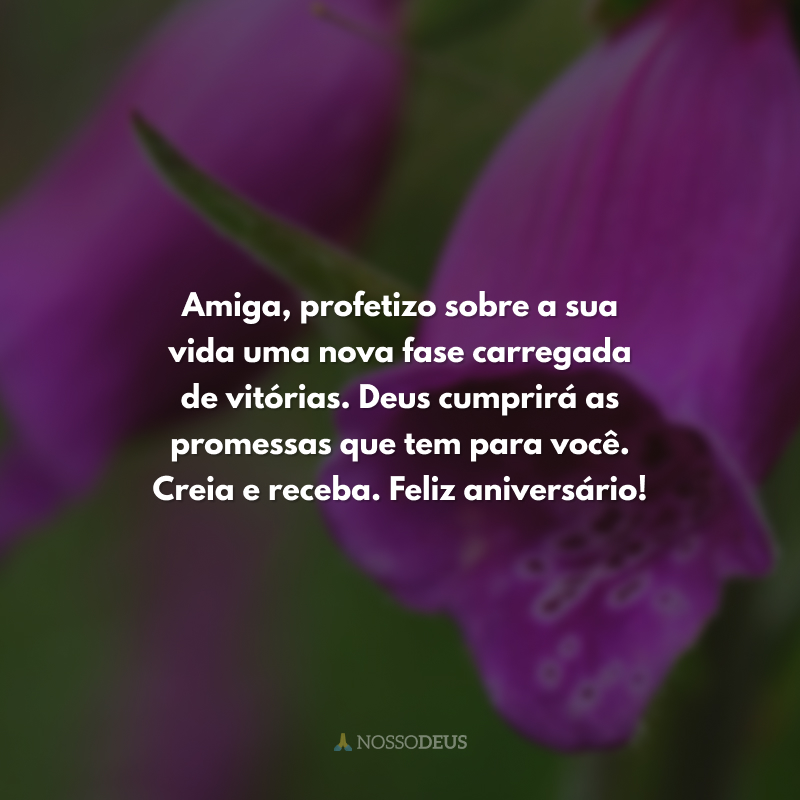 Amiga, profetizo sobre a sua vida uma nova fase carregada de vitórias. Deus cumprirá as promessas que tem para você. Creia e receba. Feliz aniversário!