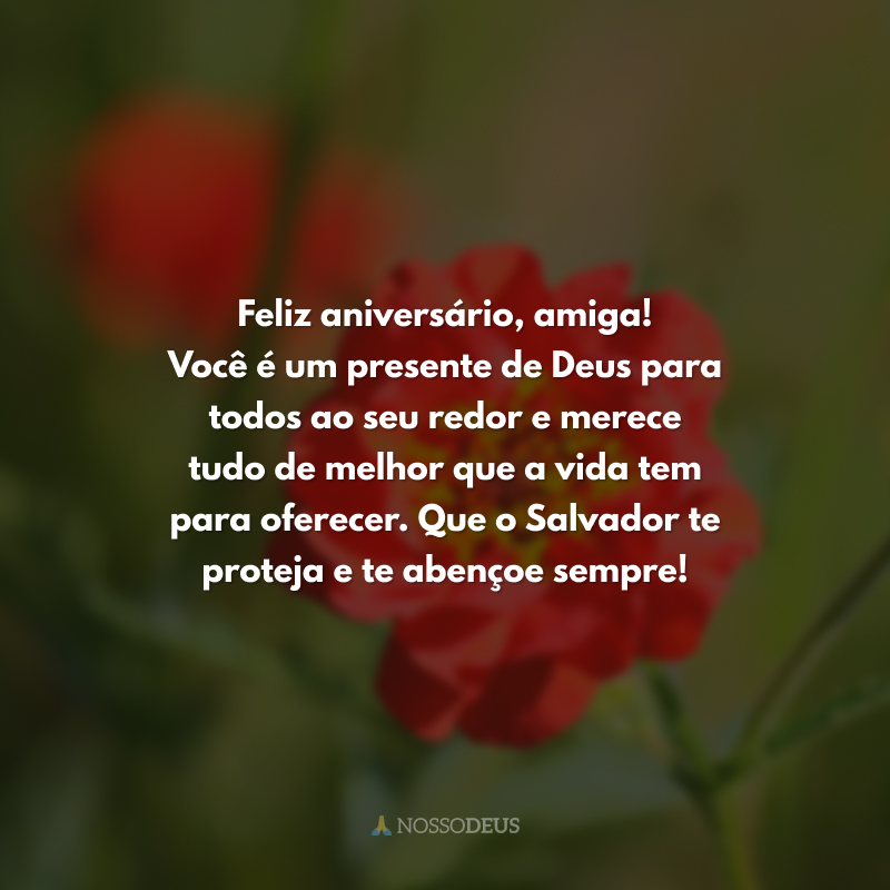 Feliz aniversário, amiga! Você é um presente de Deus para todos ao seu redor e merece tudo de melhor que a vida tem para oferecer. Que o Salvador te proteja e te abençoe sempre!