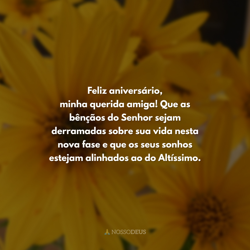 Feliz aniversário, minha querida amiga! Que as bênçãos do Senhor sejam derramadas sobre sua vida nesta nova fase e que os seus sonhos estejam alinhados ao do Altíssimo.