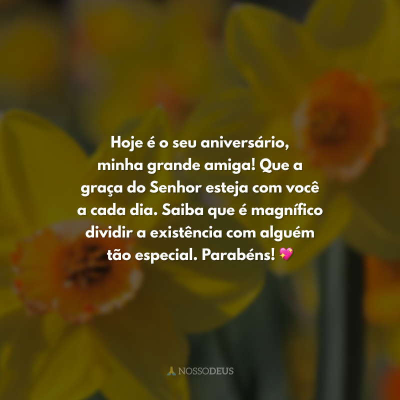Hoje é o seu aniversário, minha grande amiga! Que a graça do Senhor esteja com você a cada dia. Saiba que é magnífico dividir a existência com alguém tão especial. Parabéns! 💖