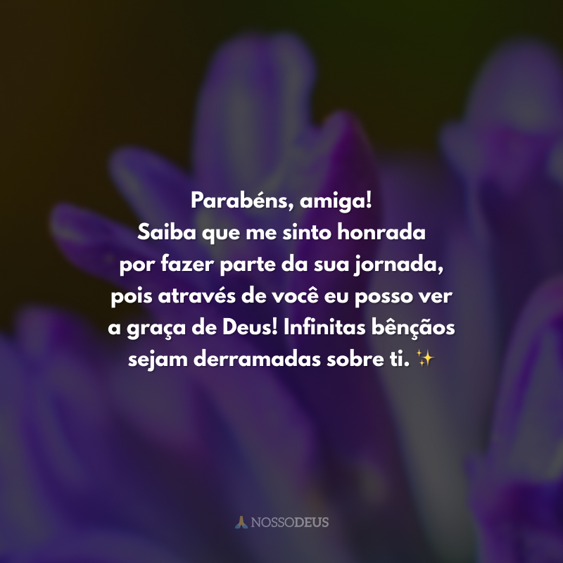 Parabéns, amiga! Saiba que me sinto honrada por fazer parte da sua jornada, pois através de você eu posso ver a graça de Deus! Infinitas bênçãos sejam derramadas sobre ti. ✨