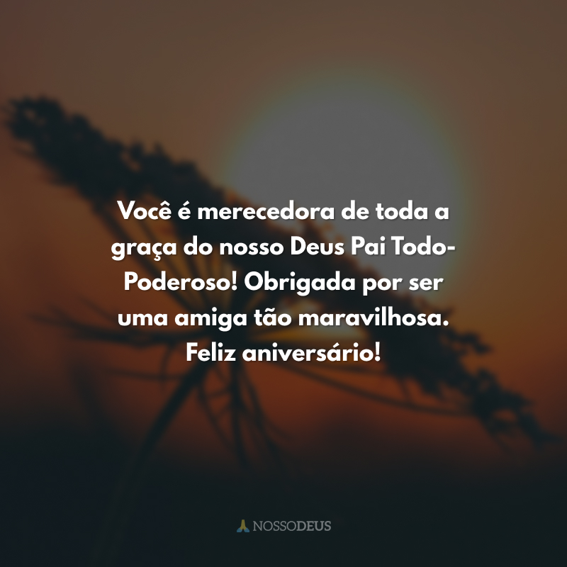 Você é merecedora de toda a graça do nosso Deus Pai Todo-Poderoso! Obrigada por ser uma amiga tão maravilhosa. Feliz aniversário!