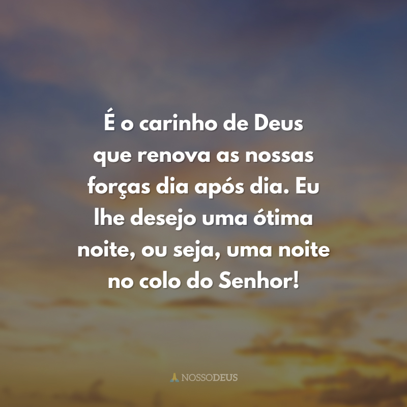 É o carinho de Deus que renova as nossas forças dia após dia. Eu lhe desejo uma ótima noite, ou seja, uma noite no colo do Senhor!