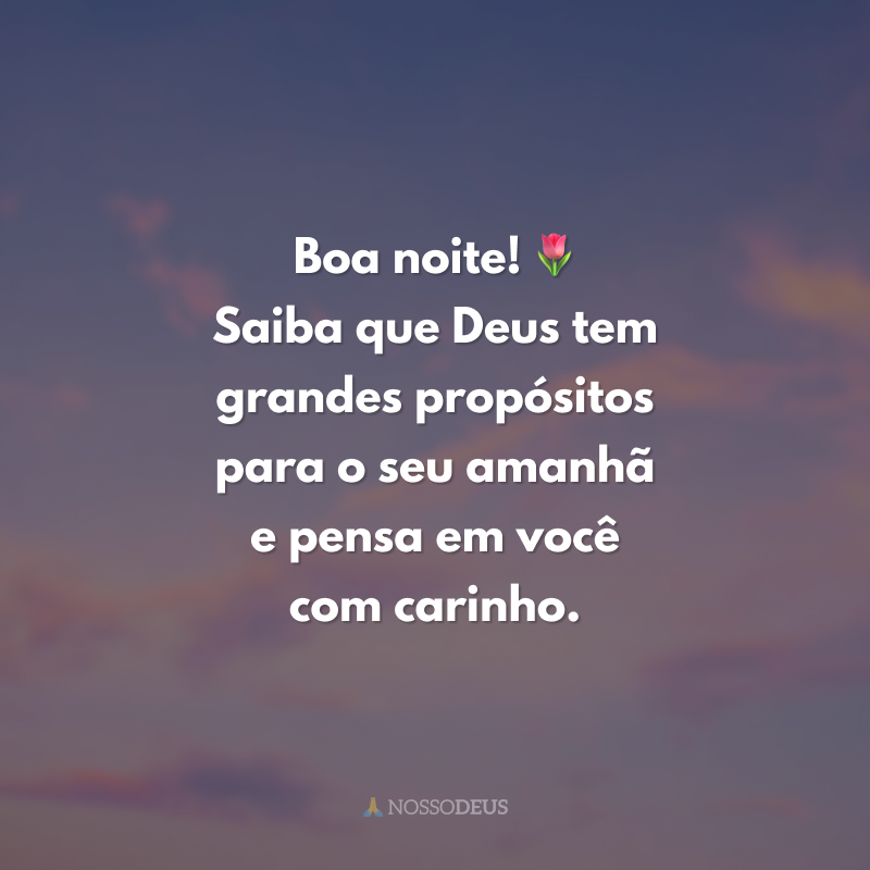 Boa noite! 🌷 Saiba que Deus tem grandes propósitos para o seu amanhã e pensa em você com carinho.