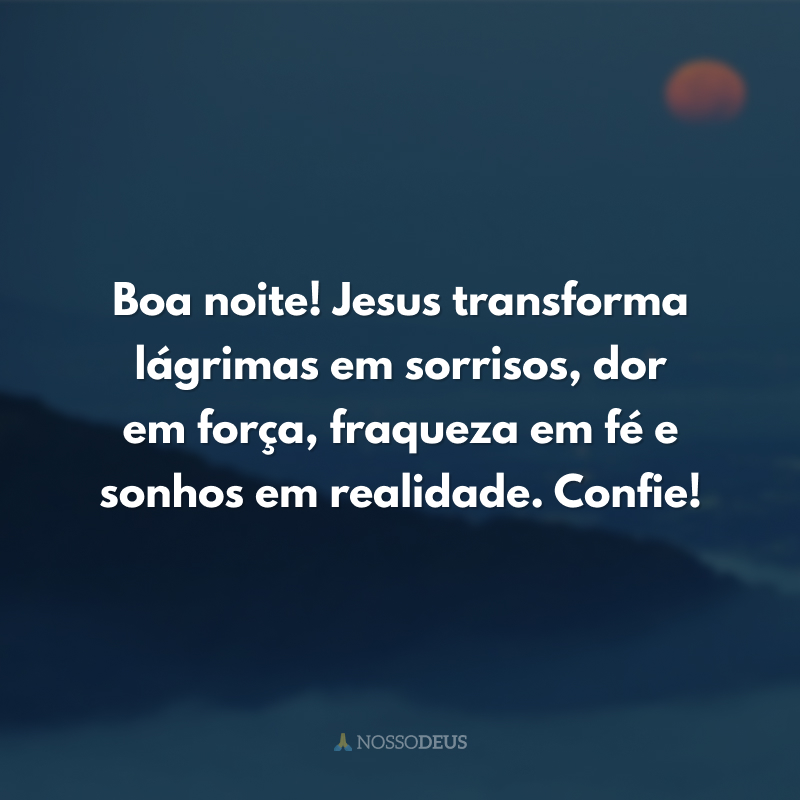 Boa noite! Jesus transforma lágrimas em sorrisos, dor em força, fraqueza em fé e sonhos em realidade. Confie!