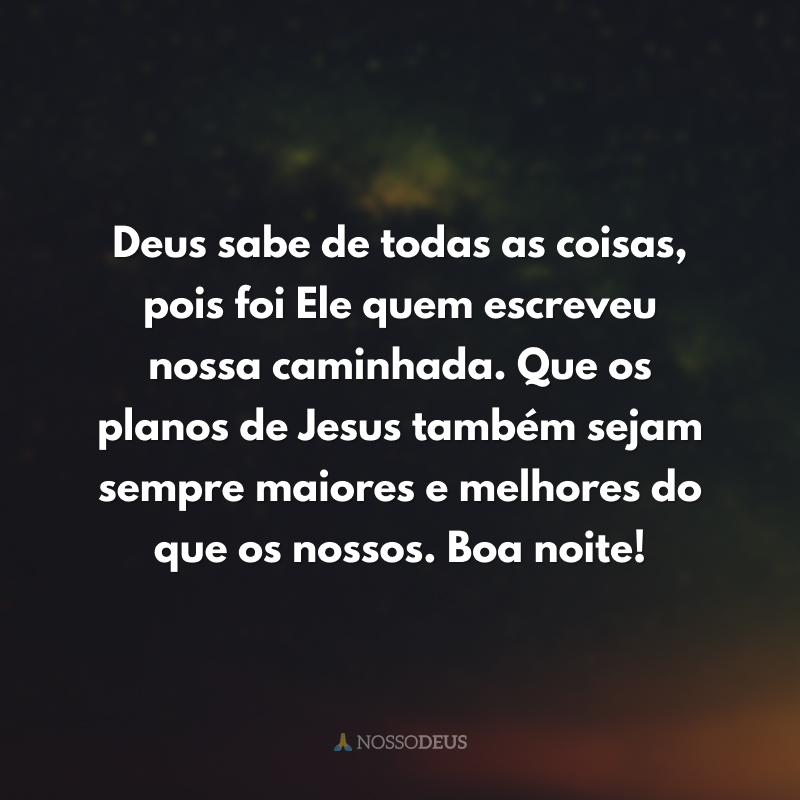 Deus sabe de todas as coisas, pois foi Ele quem escreveu nossa caminhada. Que os planos de Jesus também sejam sempre maiores e melhores do que os nossos. Boa noite!