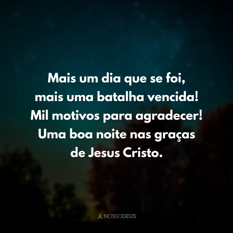 Mais um dia que se foi, mais uma batalha vencida! Mil motivos para agradecer! Uma boa noite nas graças de Jesus Cristo.