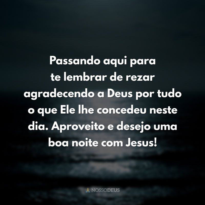 Passando aqui para te lembrar de rezar agradecendo a Deus por tudo o que Ele lhe concedeu neste dia. Aproveito e desejo uma boa noite com Jesus!