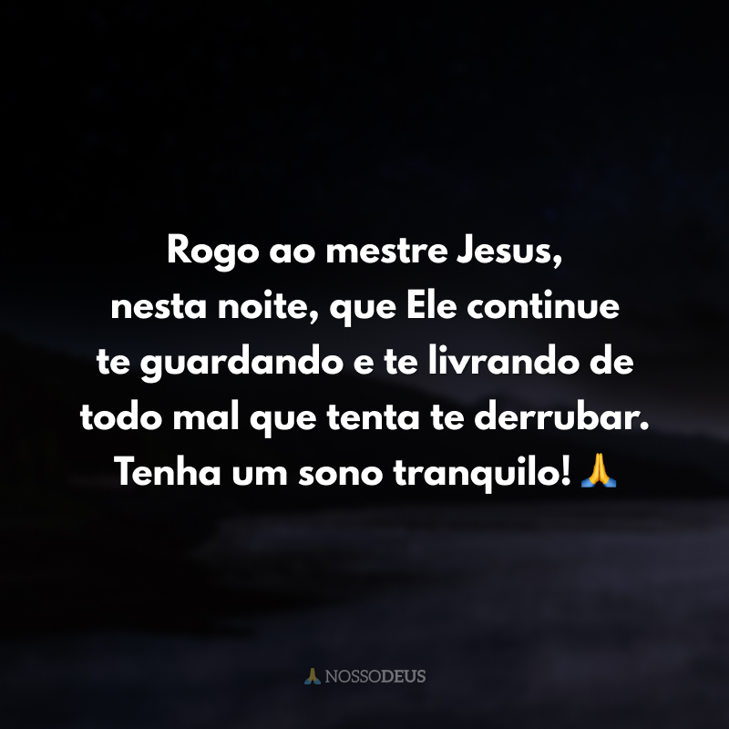 Rogo ao mestre Jesus, nesta noite, que Ele continue te guardando e te livrando de todo mal que tenta te derrubar. Tenha um sono tranquilo! 🙏