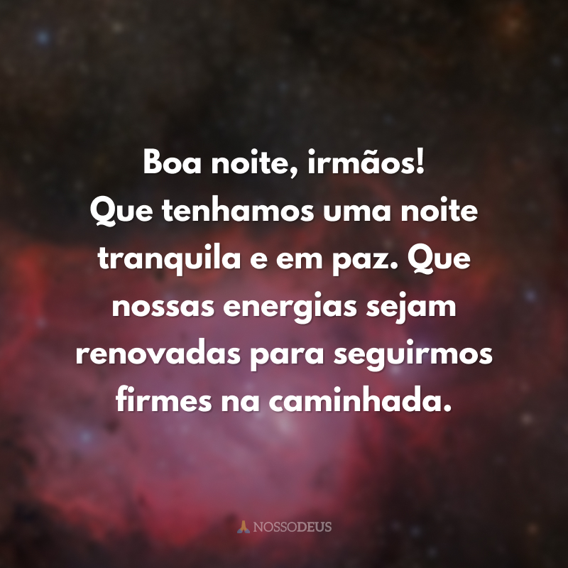 Boa noite, irmãos! Que tenhamos uma noite tranquila e em paz. Que nossas energias sejam renovadas para seguirmos firmes na caminhada.