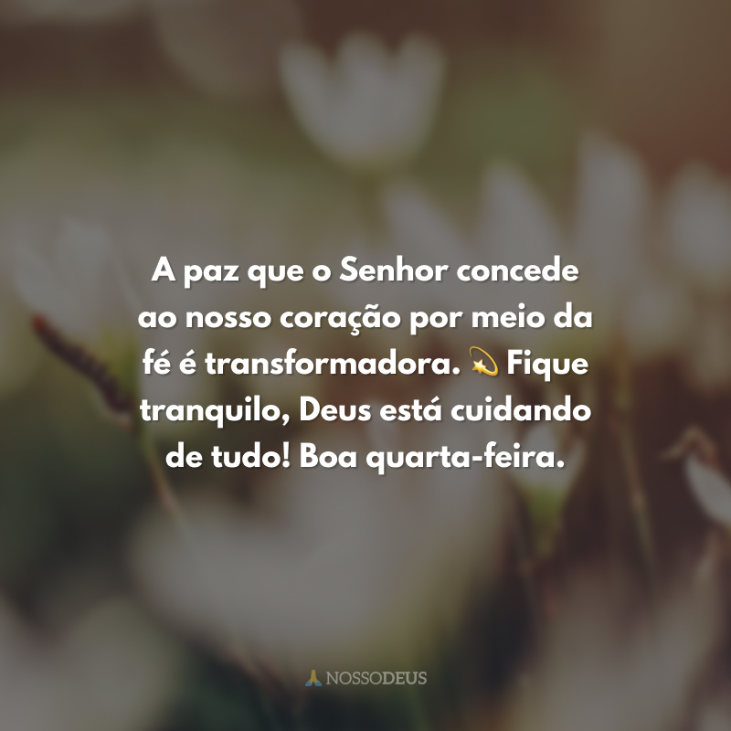 A paz que o Senhor concede ao nosso coração por meio da fé é transformadora. 💫 Fique tranquilo, Deus está cuidando de tudo! Boa quarta-feira.