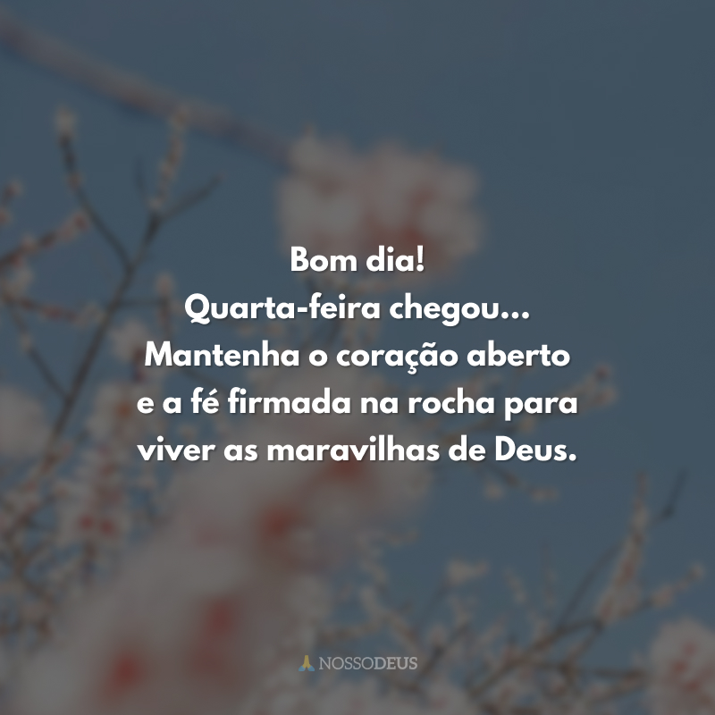 Bom dia! Quarta-feira chegou... Mantenha o coração aberto e a fé firmada na rocha para viver as maravilhas de Deus.