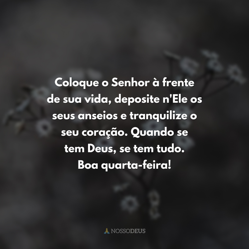 Coloque o Senhor à frente de sua vida, deposite n'Ele os seus anseios e tranquilize o seu coração. Quando se tem Deus, se tem tudo. Boa quarta-feira!