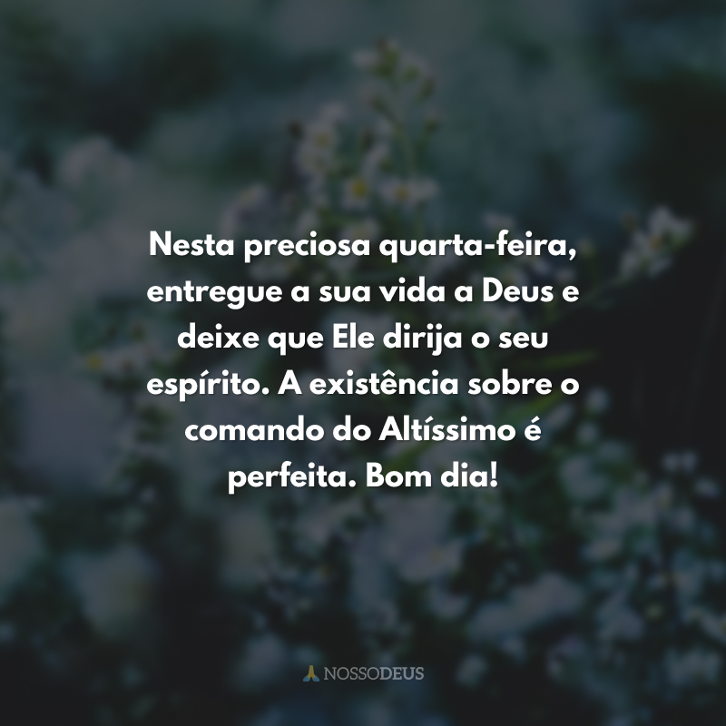 Nesta preciosa quarta-feira, entregue a sua vida a Deus e deixe que Ele dirija o seu espírito. A existência sobre o comando do Altíssimo é perfeita. Bom dia!