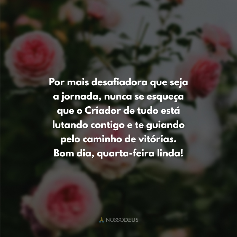 Por mais desafiadora que seja a jornada, nunca se esqueça que o Criador de tudo está lutando contigo e te guiando pelo caminho de vitórias. Bom dia, quarta-feira linda!
