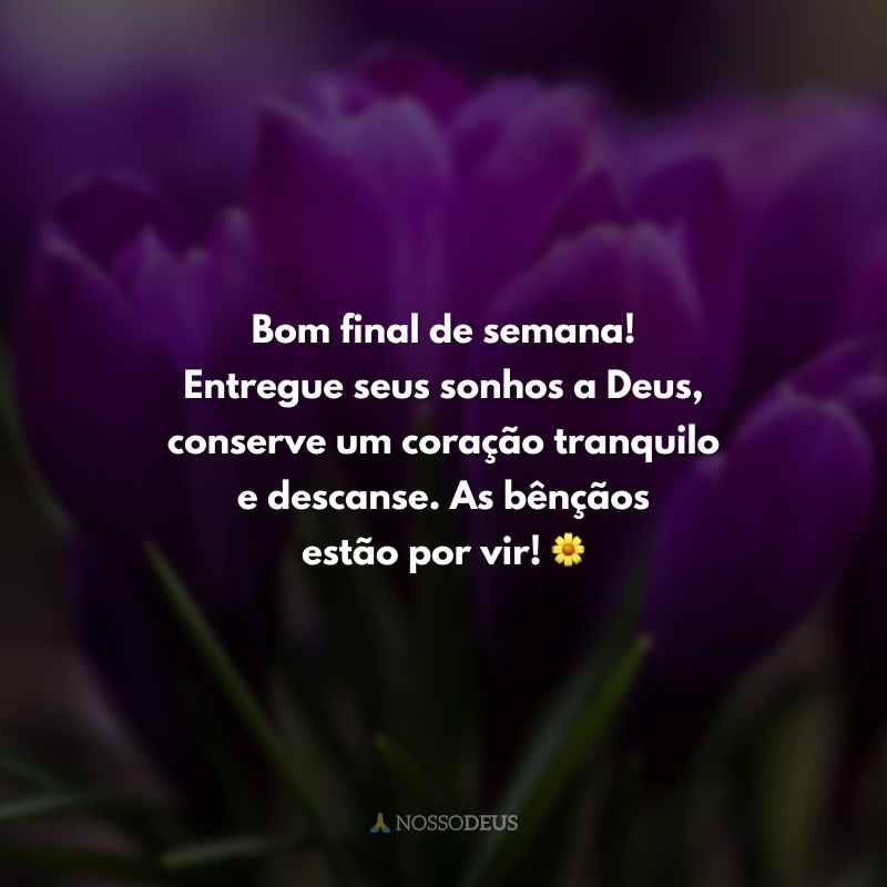 Bom final de semana! Entregue seus sonhos a Deus, conserve um coração tranquilo e descanse. As bênçãos estão por vir! 🌼