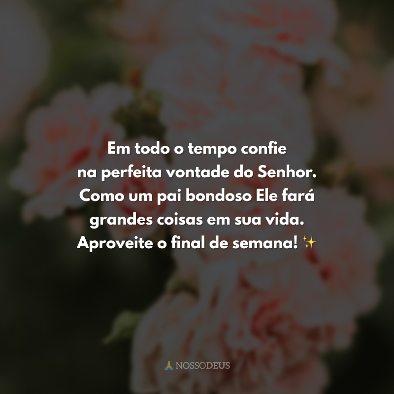 Em todo o tempo confie na perfeita vontade do Senhor. Como um pai bondoso Ele fará grandes coisas em sua vida. Aproveite o final de semana! ✨