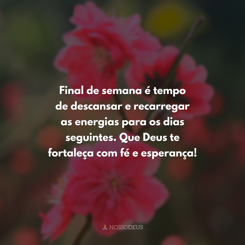 Final de semana é tempo de descansar e recarregar as energias para os dias seguintes. Que Deus te fortaleça com fé e esperança!