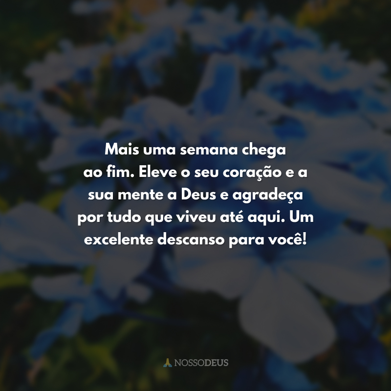 Mais uma semana chega ao fim. Eleve o seu coração e a sua mente a Deus e agradeça por tudo que viveu até aqui. Um excelente descanso para você!