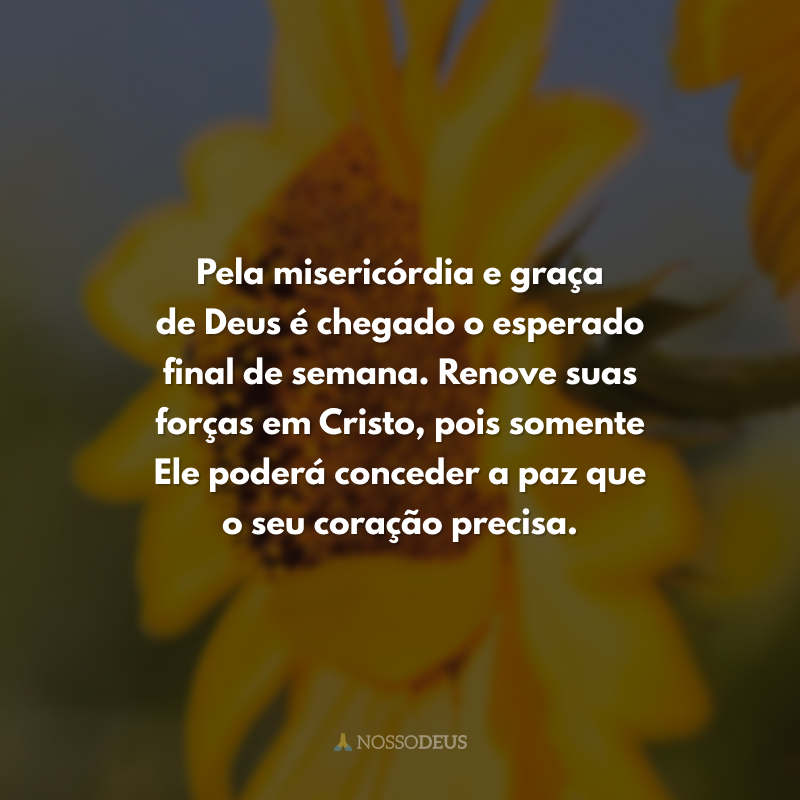 Pela misericórdia e graça de Deus é chegado o esperado final de semana. Renove suas forças em Cristo, pois somente Ele poderá conceder a paz que o seu coração precisa.