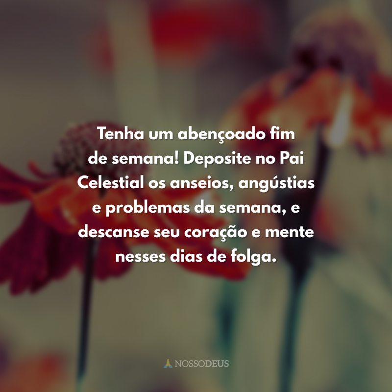 Tenha um abençoado fim de semana! Deposite no Pai Celestial os anseios, angústias e problemas da semana, e descanse seu coração e mente nesses dias de folga.