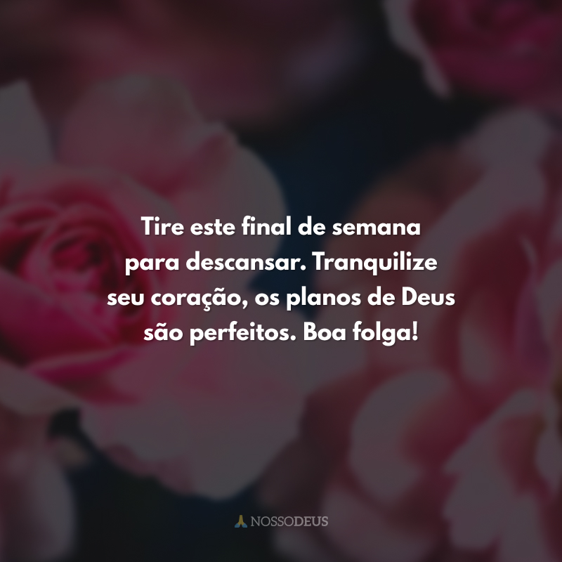 Tire este final de semana para descansar. Tranquilize seu coração, os planos de Deus são perfeitos. Boa folga!