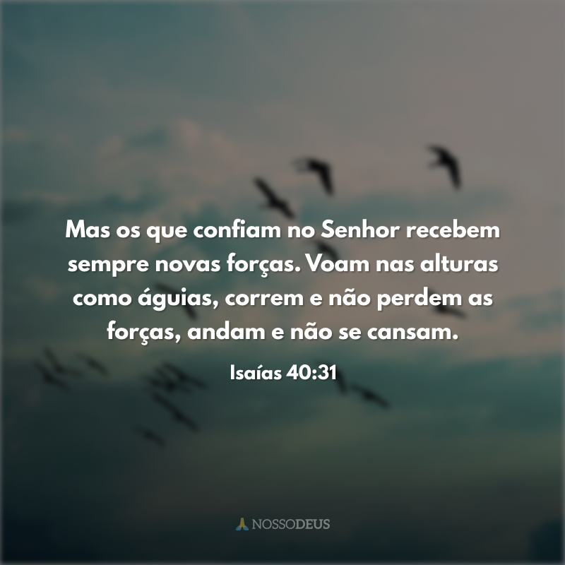 Mas os que confiam no Senhor recebem sempre novas forças. Voam nas alturas como águias, correm e não perdem as forças, andam e não se cansam.
