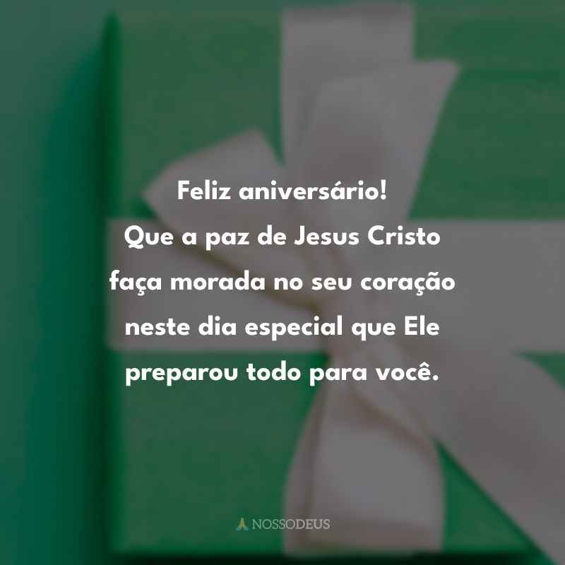 Feliz aniversário! Que a paz de Jesus Cristo faça morada no seu coração neste dia especial que Ele preparou todo para você. Saiba que Deus não desampara aqueles que são seus!