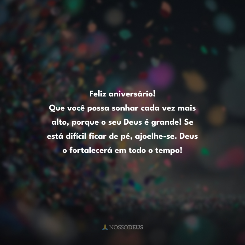 Feliz aniversário! Que você possa sonhar cada vez mais alto, porque o seu Deus é grande! Se está difícil ficar de pé, ajoelhe-se. Deus o fortalecerá em todo o tempo!