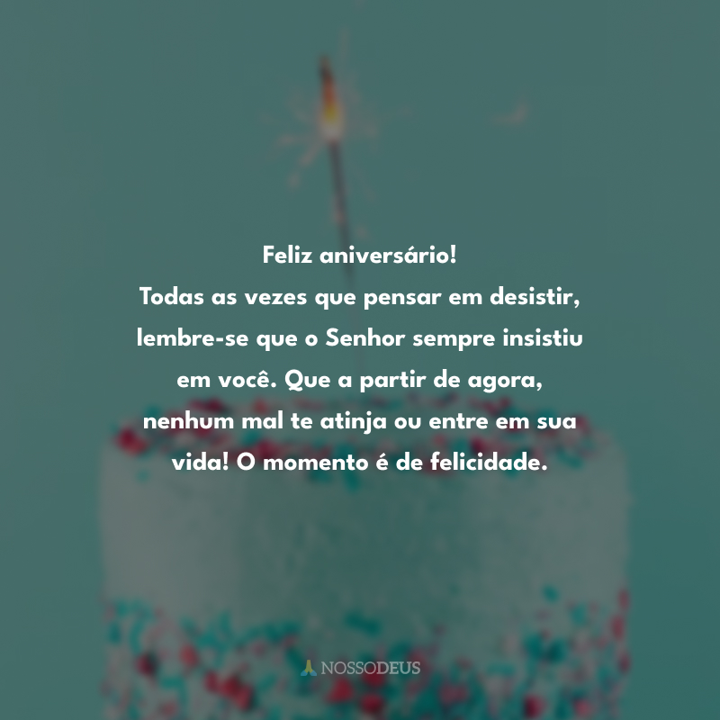Feliz aniversário! Todas as vezes que pensar em desistir, lembre-se que o Senhor sempre insistiu em você. Que a partir de agora, nenhum mal te atinja ou entre em sua vida! O momento é de felicidade.