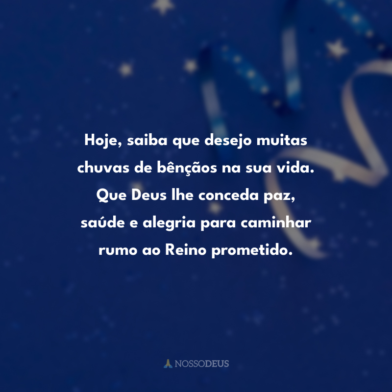 Feliz aniversário! Hoje, saiba que desejo muitas chuvas de bênçãos na sua vida. Que Deus lhe conceda paz, saúde e alegria para caminhar rumo ao Reino prometido que somente Ele é capaz de proporcionar!