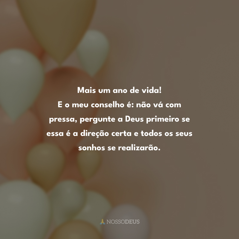 Mais um ano de vida! E o meu conselho é: não vá com pressa, pergunte a Deus primeiro se essa é a direção certa e todos os seus sonhos se realizarão. Muitas felicidades na sua caminhada!