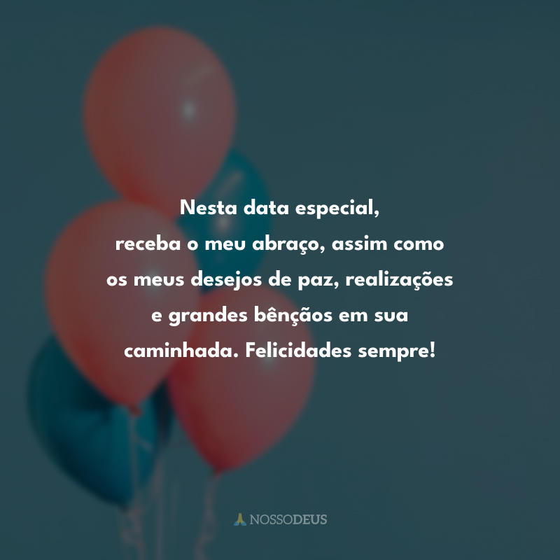 Feliz aniversário! Nesta data especial, receba o meu abraço, assim como os meus desejos de paz, realizações e grandes bênçãos em sua caminhada. Felicidades sempre! Que o Senhor esteja com você.